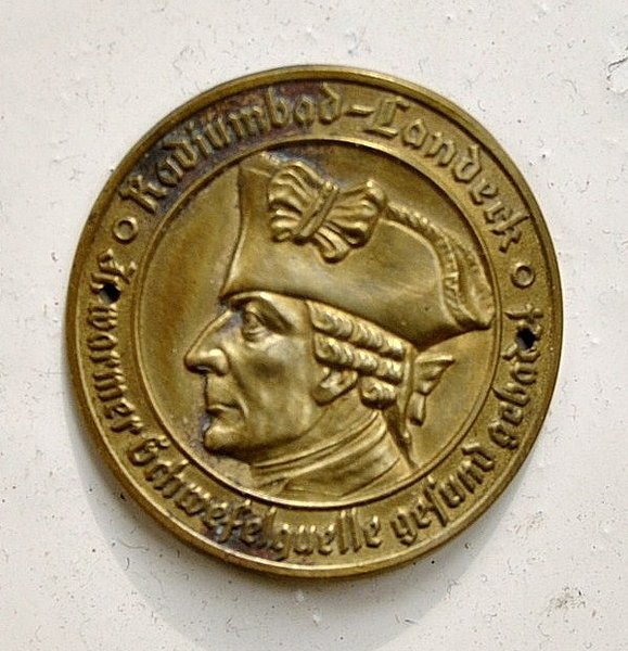 Plakette für einen Wander-Spazierstock mit dem Konterfei Friedrich des Großen von Preußen umlaufend beschriftet "Radiumbad - Landeck /In warmer Schefelquelle gesund gebadet" Maße: 3,7 cm Durchmesser. Gewicht: Verfügbarkeit: 1 x in dieser Ausführung; weitere Faschingsorden, Orden, Medaillen, Pokale und Trophäen.