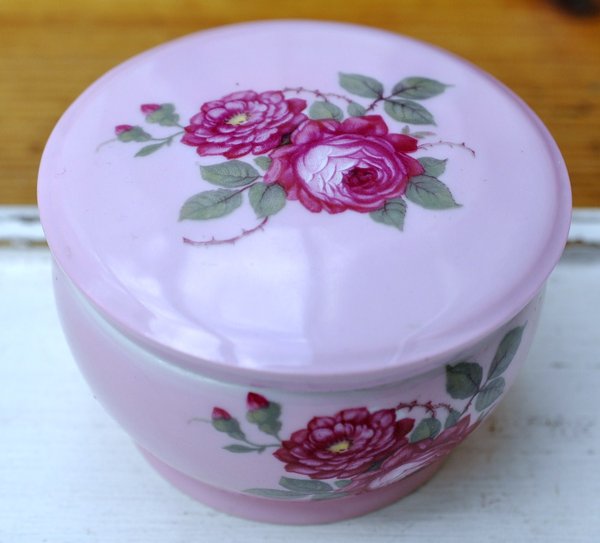 Dose: Mit Rosen bemalte Rosenthal Porzellan-Cremedose mit Schraubverschluss. Boden Stempelmarke "Rosenthal / Selb / Bavaria 711". Auf dem Innendeckel ist in Goldschrift "CREME ELECTRA parfümiert mit ROSA CENTIFOLIA / J. F. SCHWARZLOSE SÖHNE / BERLIN". Die Fabrik für Toilettenartikel wurde 1944 zerstört, dann umgesiedelt und 1976 endgültig aufgegeben. Maße: 9 cm Durchmesser; 6 cm H. Leergewicht: 190 Gramm. Verfügbarkeit: 1 x in dieser Ausführung; weitere Cremedosen / Deckeldosen und Toilettenartikel.