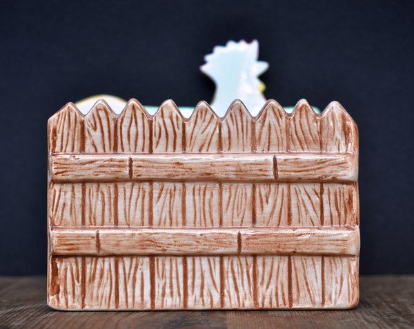 Porzellanbehälter: Rechteckiges, elfenbeinfarben glasiertes Osternest, hier in Form einer Henne am Gartenzaun. Gewicht: 370 Gramm. Verfügbarkeit: 1 x in dieser Ausführung; weitere Osternester.