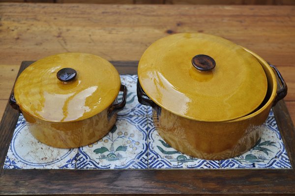 Kunsthandwerk "Potterie de Haute Provence": Von Hand getöpferte, gelb glasierte Suppen-Terrine mit Deckel und zwei brauen Handhaben. Die Terrine ist Teil eines 25-teiligen Services. Die Terrine hat keine Beschädigungen. Maße: 23 cm Durchmesser; 12 cm H. Gewicht: 2500 Gramm. Verfügbarkeit: 2 x in dieser Ausführung in unterschiedlichen Größen; weitere Tafelservice, Suppenterrinen.