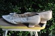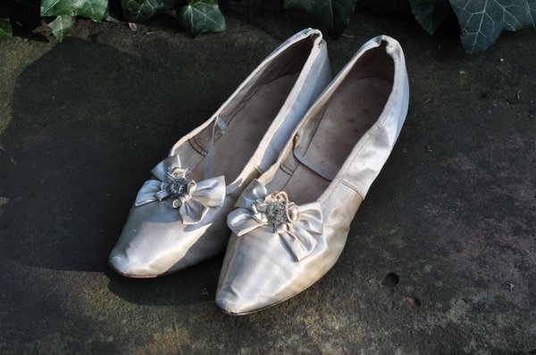 Paar Schuhe: Modische Accessoires zum Brautkleid der 1920er Jahre, hier Damenschuhe aus cremefarbenem Seidensatin mit Schleife und Glasperlchen, sogenannte "Pumps" - hier mit den so geannten Bobinetabsätzen. Geschätze Schuhkonfektionsgröße 36. Die Pumps sind getragen. Gewicht: 300 Gramm. Verfügbarkeit: 2 x Paare ähnliche Brautschuhe. Ausleihgebühr für 3 Tage: 14,40 Euro. Ausleihgebühr für 3 Wochen: 20.00 euro. Ausleihgebühr für 3 Monate: 40.00 Euro.