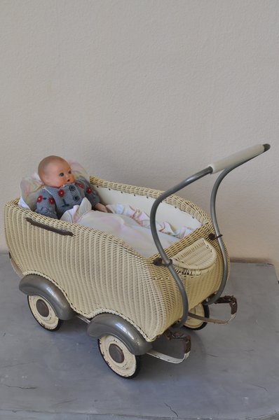 Puppenwagen: Mädchen-Spielzeug der 1930er Jahre, hier Korb-Puppenwagen mit weiß lackierter Kunststoff-Korbgeflecht-Wanne auf Metall-Chassi, gummibereifte Metallscheibenräder mit Schutzblech-Teilverkleidung, Lederaufhängung, verchromte Schiebestange mit Holzgriff, Frontfach mit Klappe, Original-Matratze aus der Zeit, mehrere Kissen und Decken. Das Sonnenschutz-Verdeck am Puppenwagen fehlt. Maße: 70 cm L; 37 cm B; 43 cm H; Gesamthöhe mit Griff 72 cm. Verfügbarkeit: 2 x in fast gleicher Ausführung; weitere Körbe / Puppenwagen / Kinderwagen.