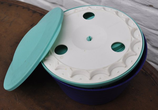 Schleuder: Zweifarbige, vierteilige Salatschleuder "Tupperware": Artikelnummer 3779A-I. Maße: 26 cm Durchmesser; 15 cm H. Gewicht: 800 Gramm. Verfügbarkeit: 1 x in dieser Ausführung; weitere Salatsiebe / Siebe.