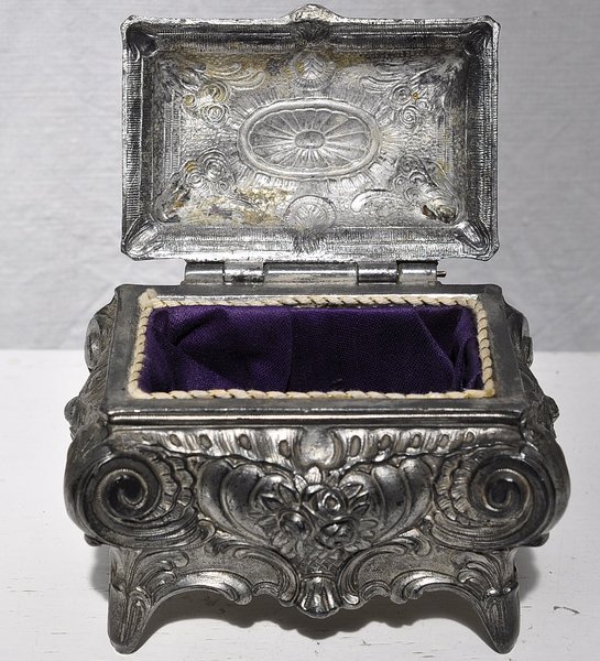 Schmuckschatulle 20. Jh.: Kleines Schmuckkästchen mit Scharnierdeckel im Historismusstil nach Barockvorlage mit Rocaillen und Voluten verziert, hier Zinnguss umlaufend aufwendig reliefiert, innen mit lila Baumwollsatin ausgeschlagen. Maße: 12 x 8 x 8 cm. Gewicht: 450 Gramm. Verfügbarkeit: 1 x in dieser Ausführung; weitere Schmuckschatullen / Schmuckkästen und Schmuckablagen.