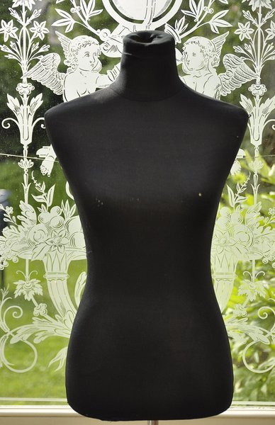 Schneiderpuppe: Höhen- verstellbare Schneiderpuppe auf verchromtem Rundfuß, hier Kunststoffkorpus mit schwarzem Futterstoff bezogen, Damen-Konfektionsgrößen 38. * Konfektionsgrößen: 38. Verfügbarkeit: 1 x in dieser Ausführung; weitere Schneiderpuppen / Schaufensterpuppen aus verschiedenen Epochen.