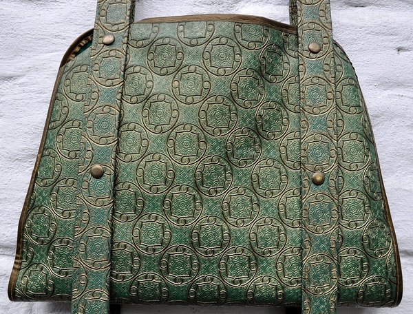 Taschenregal: Seltenes 1920/30er Jahre "Schrank- bzw. Taschenregal" - ein praktisches und platzsparendes Regal am Bügel, bestehend aus 4 Gold- geprägten Sortiertaschen für Kleinigkeiten wie Strümpfe und anderes. Dazu ein Extrabügel im gleichen Muster.** Gewicht: 700 Gramm. Verfügbarkeit: 1 x in dieser Ausführung; weitere Regale, Taschen und Kleiderbügel.