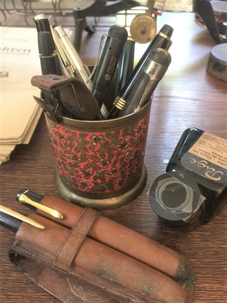 Schreibzeug: Konvolut altes Schreibzeug wie Füller, Vierfarbenstifte ( Mont Blanc) im Behälter; Tintenglas.