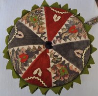Kopf-Kissen: Hier volkskundliches Accessoires zur Schwälmer Tracht / Marburger Gegend, ein sogenannter "Brautkitzel", hier in Patchwor- und Applziertechnik aus bunten Samtresten, Filzen und Litzen. Der Kitzel ist ein "Kopf-Kissen" zum Abpolstern und Tragen von Kuchenblechen, Körben und Eimern auf dem Kopf und gehörte in vielen ländlichen Gegenden zur Tracht der Mädchen und Frauen. Der Kitzel wurde aus Sparsamkeitsüberlegungen aus Stoffresten mit der Hand genäht und meistens mit Rosshaar stramm gefüllt und war Bestandteil der Aussteuer. Maße: 32 cm Durchmesser. Gewicht: 550 Gramm. Verfügbarkeit: 1 x in dieser Ausführung; weitere Kitzel und Trachtenzubehör.