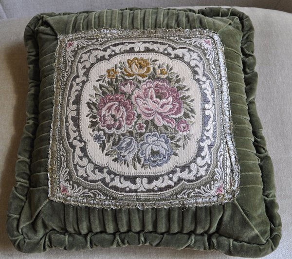 Kissen: Kleines Sofa-Kissen mit Füllung. Durchgewebter Brokatstoff mit Rosen im Mittelfeld, Samtrücken mit gesmokter Kante. Maße: 40 x 40 cm. Gewicht: 1000 Gramm. Verfügbarkeit: 2 x in ähnlicher Ausführung.