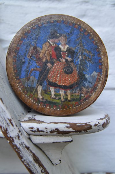 Dose / Volkskunst aus Berchtesgaden: "Kleine Geschenke werben und erhalten die Freundschaft". Hier runde Spanschachtel des beginnenden 19. Jh. Hier eine sogenannte "Minnegabe". Der Deckel ist bemalt mit einem Liebespärchen in bayerischer Tracht in Leimlasurfarben. Die kleinen Spanschachteln waren oft Geschenke zwischen Brautleuten. Maße: 10 cm Durchmesser; 5 cm H. Gewicht: 30 Gramm. Unikat: Weitere Tabakdosen und Tabatieren. Ausleihe 2012: "Die geliebten Schwestern" / BAVARIA.