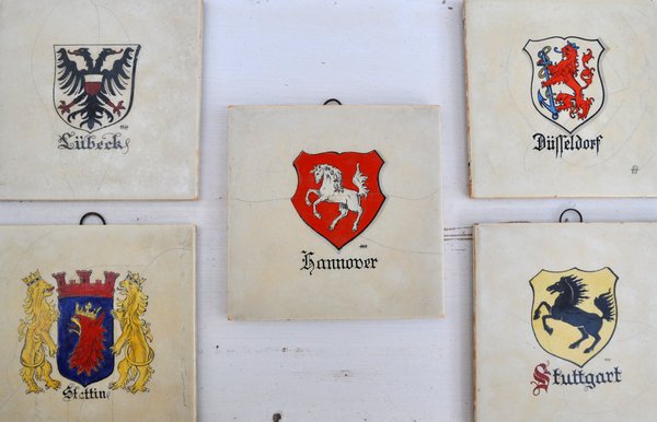 Heraldik / Wappen: Glasierte Krakelee-Kachel, typisch für die 1940er Jahre. Stadtwappen der Hansestadt Lübeck "Schwarzer Doppeladler auf weißem Grund". Maße: 10 x 10 cm. Verfügbarkeit: 5 x Stadtwappen in gleicher Ausführung: Hannover, Stuttgart, Stettin, Düsseldorf.