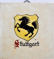 Heraldik / Wappen: Glasierte Krakelee-Kachel, typisch für die 1940er Jahre, Stadt Stuttgart. Motiv "Schwarzes springendes Pferd auf gelbem Grund". Der Name Stuttgart generiert von "Stuten Garten", d.h von der Perdezucht bzw. vom Gestüt in Marbach bei Stuttgart. Maße: 10 x 10 cm. Verfügbarkeit: 5 x Stadtwappen in gleicher Ausführung: Hannover, Düsseldorf, Stettin, Lübeck.