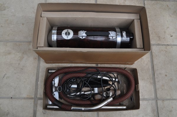 Elektrogerät der 1930/40er Jahre: Boden-Staubsauger Marke PROGRESS, Type P 7 No.36492 220 V; 330 W mit diversen Zusatzteilen im Originalkarton. Bestzustand. Funktion jedoch nicht geprüft. Maße des Kartons: 62 cm L; 29 cm B; 33 cm H. Verfügbarkeit: 1 x in dieser perfekten Ausführung.