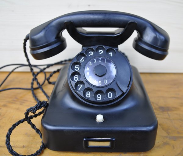 Vintage Telefon: "Das W 48" m I / 9.62 (nach seinem Enstehungsjahr 1948), hier Telefon der 1960er Jahre. Schwarzes Bakelitgehäuse mit Loch-Wählscheibe aus Bakelit; Klingelton mittels zweier Schellen im Gehäuse; geflochtene Schnur. Sehr guter Zustand. Gewicht: 2000 Gramm. Verfügbarkeit: 4 x in fast identischer Ausführung; weitere Vintage Telefone / Fernsprecher. Ausleihgebühr für 3 Tage: 14,40 Euro. Ausleihgebühr für 3 Wochen: 20,00 Euro.