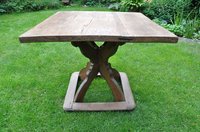 Kreuztisch: Mittelgroßer Tisch aus einem Kloster in der Gegend von Bad Aibling. ca. 1780: Ein so genannte "Kreuztisch" mit vier kreuzweise ineinanderlaufenden, geschweiften Beinen, die in einer umlaufenden Fußleiste enden. Die fast quadratische Tischplatte ist aus Hartholz. Maße: 91 cm L; 95 cm B; 76 cm H. Verfügbarkeit: 1 x ind dieser Form; ferner weitere "Bauerntische" in Weichholz und Hartholz. Literatur: Anton Kugler in Battenberg Antiquitäten-Kataloge: "Bauernmöbel", Battenberg Verlag München 1977, S.97 Abb.47.