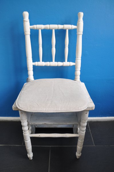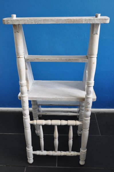 Leiter / Stuhl: Der praktische Küchenhelfer um 1900, hier ein Küchenstuhl, der durch Umlegen der Rückenlehne mit einem Handgriff zur 4-stufigen Trittleiter wird.. Solche Arbeitshilfen waren in großen Altbauküchen um 1900 üblich, um Töpfe und Geschirr von den eingebauten Holzregalen herunter zu holen. Verfügbarkeit: 1 x in dieser Ausführung als Leiter; weitere Küchenstühle / Leitern / Klappleitern.