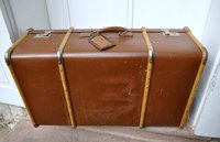 Koffer: Reise- Überseekoffer der 1950er Jahre im Stil der alten"Rohrplattenkoffer" um 1900, hier in Form gepresst mit rotbraun eingefärbter Oberfläche. Vier Bugholzbänder und verchromte Schleifkappen verstärken den Koffer; zwei verchromte Schnappschlösser sichern den Koffer. Geringe Gebrauchsspuren und hygienischer Erhaltungs- und Gebrauchszustand. Die Schlüssel zum Koffer fehlen.** Gewicht: 5000 Gramm. Verfügbarkeit: 1 x in dieser großen Ausführung; weitere Vintage-Koffer und Überseekoffer.