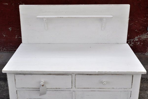 Kommode: Schlichte 2-türige Waschkommodemit Schubladen-Schrankunterteil und Aufsatz-Ablagebrett für Kosmetikartikel. Die Kommode wurde restauriert und sekundär im Shabby Chic Stil patiniert. Zur Kommode gehört ein ovaler Wandspiegel im Holzrahmen. Verfügbarkeit: 1 x in dieser Ausführung; weitere Waschkommoden und Waschtische.