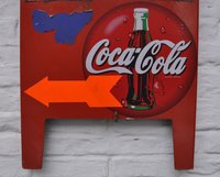 Aufsteller / Reklame: Kunststoffaufsteller mit Werbeaufdruck "Coca Cola", darüber Werbung für Bratwurst. Maße: 54 cm B; 5 cm T; 118 cm H. Verfügbarkeit: 1 x in dieser Ausführung; weitere Werbeträger / Werbeschilder und Werbedisplays.