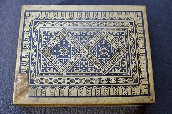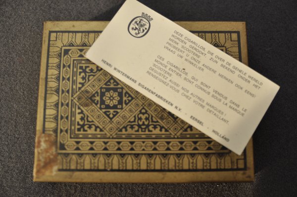 Blechdose: Leere, orientalisch gemusterte Zigarillodose ohne Aufschrift, hier innen mit Holz ausgeschlagen. Hersteller "HENRI WINTERMANS SIGARENFABRIKEN N.V. - ERSEL - HOLLAND" für Zigarillos 20 PF das Stück, weltweit vertrieben unter dem Namen SCOOTERS. Maße Dose: 12,5 x 10 x 3 cm. Gewicht: 190 Gramm. Verfügbarkeit: 1 x in dieser Ausführung; weitere Blechdosen für Zigarillos, Zigarrenkisten und Zigarettendosen.