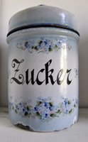 Vorratsdose: Urgroßmustters Küchenausstattung, hier hellblaue Email-Vorrats-Deckeldose mit Vergissmeinnicht-Umdruckdekor und schwarzer Aufschrift "Zucker". Allseitig geringfügige Email-Abplatzer.* Gewicht: 500 Gramm. Verfügbarkeit: 1 x in dieser Ausführung; weitere Blechdosen, Zuckerdosen, Vorratsbehälter. Deckeldosen / Vorratsdosen. Ausleihgebühr bis zu 3 Monaten: 20.- Euro.