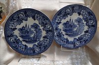 Teller: Zwei Steingutteller mit Unterglasur-Blaumalerei im chinesischen Stil. Motiv "Ein Pärchen am See vor einem Palast". Hersteller Bodenmarke J. MARSHALL & CO / Dekor BOSPHORUS. Keine Beschädigungen. Maße: 24 cm Durchmesser. Gewicht: 500 Gramm. Verfügbarkeit: 2 x identische Teller.