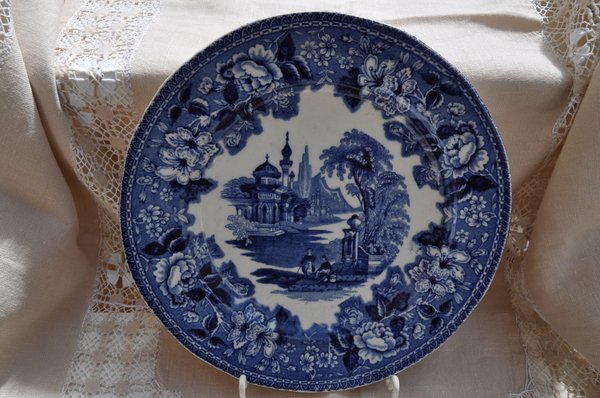 Teller: Zwei Steingutteller mit Unterglasur-Blaumalerei im chinesischen Stil. Motiv "Ein Pärchen am See vor einem Palast". Hersteller Bodenmarke J. MARSHALL & CO / Dekor BOSPHORUS. Keine Beschädigungen. Maße: 24 cm Durchmesser. Gewicht: 500 Gramm. Verfügbarkeit: 2 x identische Teller.